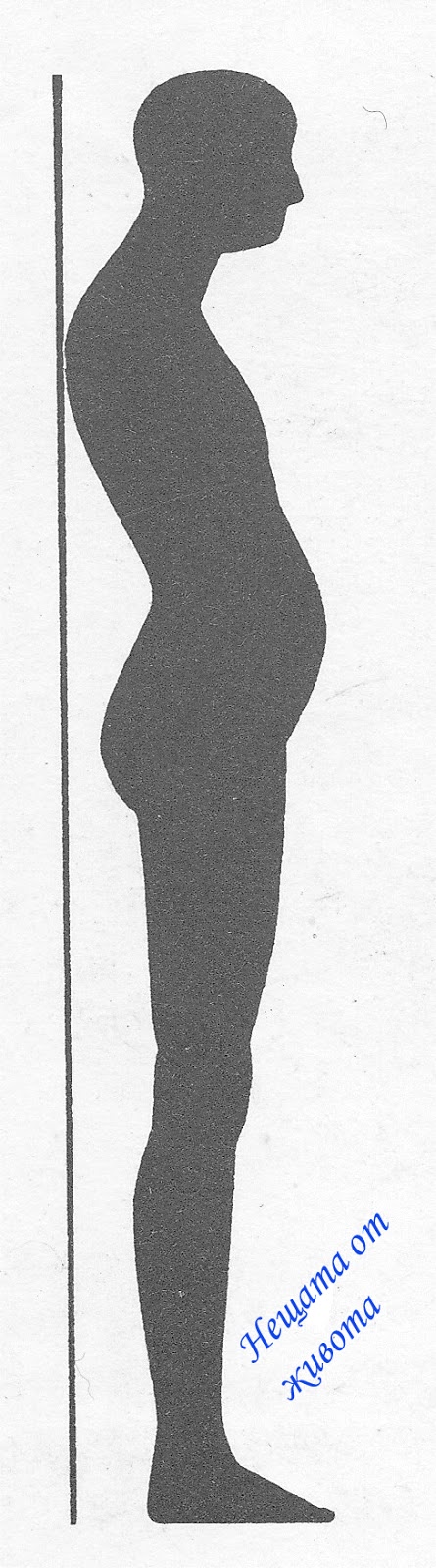 По-нататък, при по-големите деца, в момента на прохождането и през втората и третата го-дина се констатира често много силно навеждане напред, с издаден корем. Това положение не може да се приеме за нормално, но се среща често на тази възраст. То е свързано с една „хипотония“ (липса на еластичност, на „тонус“) и също е преходен етап. Това положение малко по малко изчезва през време на детството, без да става нужда да го лекуваме.